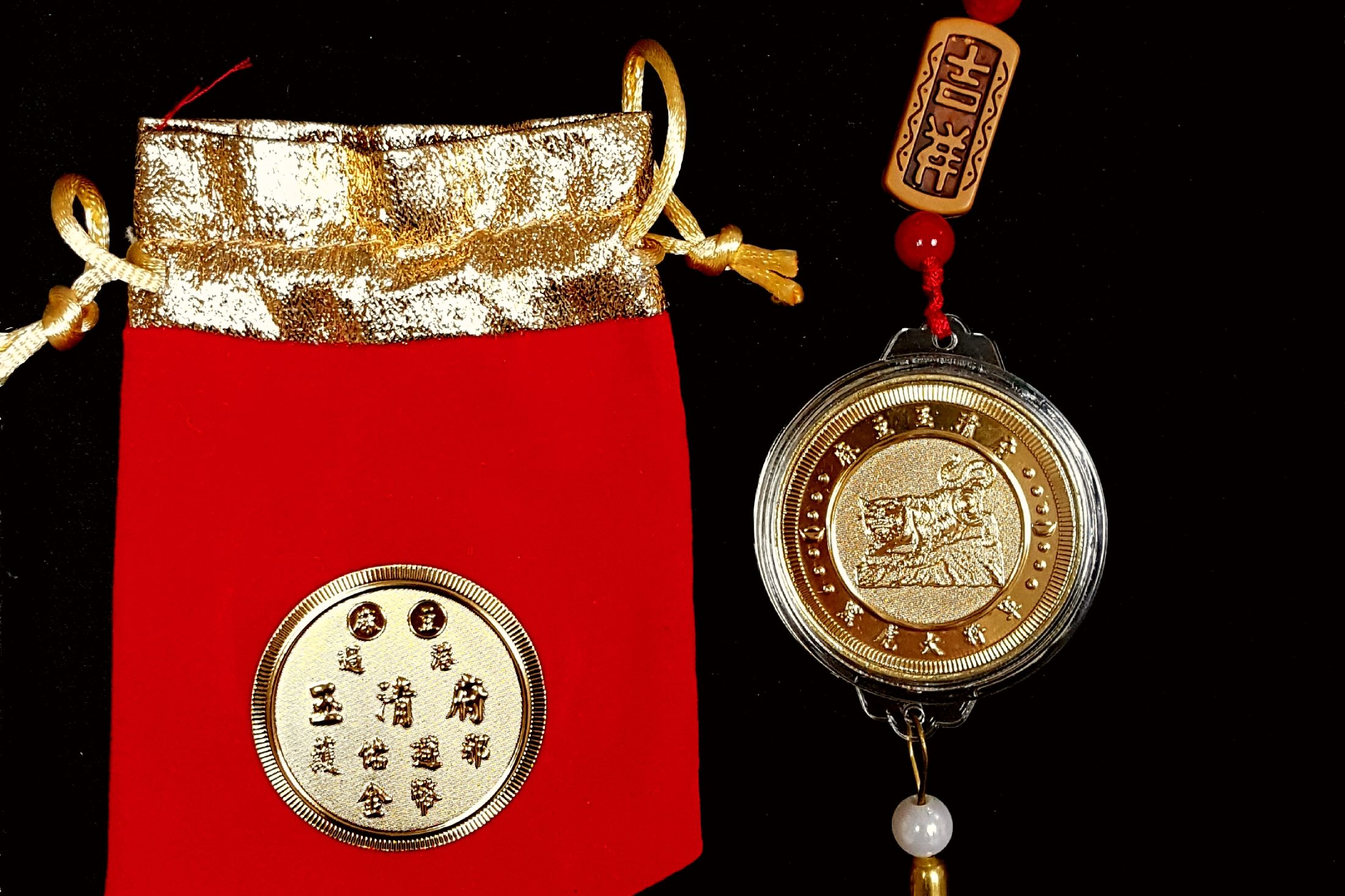 過港仔祖師公 開運神物 祖師慈悲,特賜信徒大德”開運招財避邪金幣”吊飾 天運歲次:戊戌年開運神物 正面為 玉清…